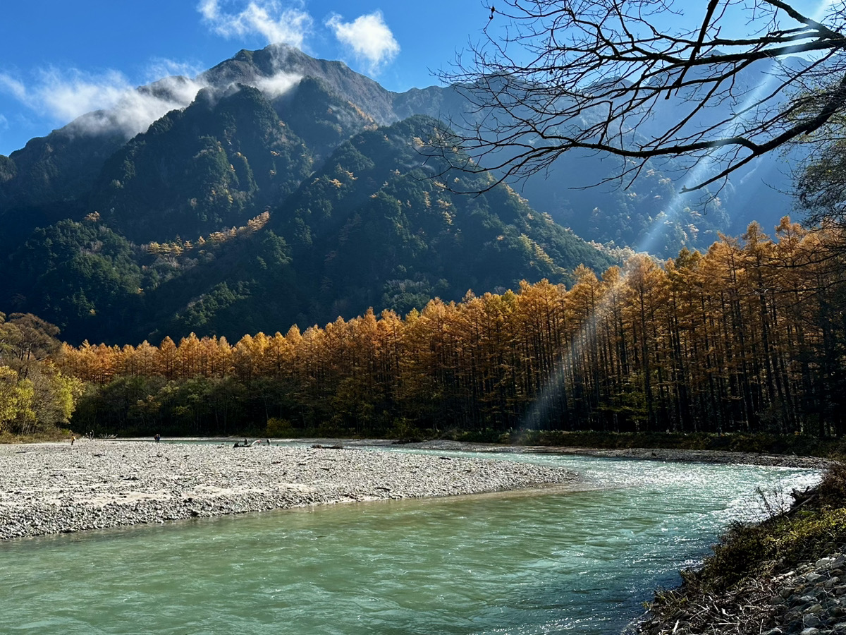 After you've snapped your commemorative shot of Kappa Bridge, why not take a walk downriver toward Tashiro Bridge? Along the way, you'll be treated to a panoramic view of the larch trees along the Azusa River with a stunning mountain backdrop. The crook in the river shown in the above photo is called 大曲 ("Oomagari") in Japanese, which lietrally means "the big bend."